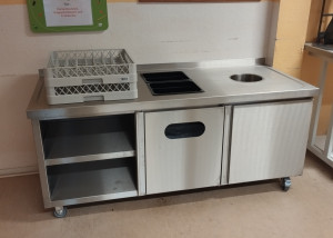 Eine fahrbare Geschirrrückgabestation komplett aus hochwertigem nichtrostendem Edelstahl. Hier wurde bewusst auf eine kindgerechte Ausführung geachtet. Gleichzeitig ist die Ausgabe leicht für die Mitarbeiter der Küche zu händeln. Natürlich ist es auch wichtig eine optisch ansehnliche Lösung zu gestalten. Rückgabe von Geschirr und Besteck sowie eine einfache Restetrennung sind nun gut möglich.